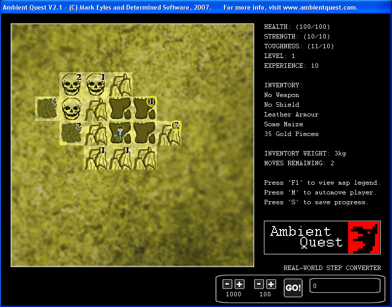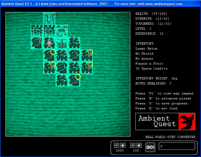 Ambient Quest screenshots: Version 1, Version 2.2 Aztec Myth and Hostile Planet themes. Click images for full size screens. ![]() ![]() ![]() About Ambient Quest: Ambient Quest was designed by Mark Eyles and coded by Neil Dansey of Determined Software with graphics by Mike Rawlings (email Mike) and is not freeware. However, for a limited time, it is freely available for download from this website. We offer no guarantees with this software and do not offer any technical support. Ambient Quest has been used on a variety of PCs running Windows XP and is not resource hungry. Download the latest version of Ambient Quest: Ambient Quest zip file (3.8Mb) or Ambient Quest rar file (2.8Mb) (C) Mark Eyles and Neil Dansey, 2007-8. By downloading Ambient Quest you are agreeing to Determined Software's terms and conditions, see the 'Legal bit' at the bottom of this webpage before downloading. Ambient Quest version 1.0 was first played at the Women in Games 2007 Conference, 19th-21st April 2007. The Ambient Quest version 1.0 web page is here: Ambient Quest version 1.0 Find out more about ambient games and Ambient Quest here: Ambient role playing games: towards a grammar of endlessness and here: slides for a presentation on ambient role playing games Please contact Mark Eyles with any thoughts or observations on Ambient Quest or ambient games. Ambient Quest was created primarily as a tool for academic research, though there seem to be possible future commercial applications for ambient games. Game instructions: Unpack the files, keeping the folder structure intact (you end up with a folder containing 'images' and 'logs' folders and an AQv2.2.exe file). To play the game run the AQv2.2.exe file by double clicking it. There is no need to install Ambient Quest and it does not copy files anywhere else on your computer. The game loads up into a window on your desktop. Press the 'I' key for instructions. You can quit at any time by pressing the 'Esc' key. Contact details: Dr Mark Eyles Email: mark@eyl.es ![]() Neil Dansey's Determined Software The legal bit: This product is distributed "as is". No warranty of any kind is expressed or implied. Customers use this software at their own risk. Determined Software will not be liable for data loss, damages, loss of profits or any other kind of loss while using or misusing this software. Determined Software has made every effort to ensure that this software is in good working order, and that information contained within external files and this website is correct. However, Determined Software does not guarantee that this software is 100% free from errors or that the information (particularly regarding minimum technical requirements) is 100% accurate. |